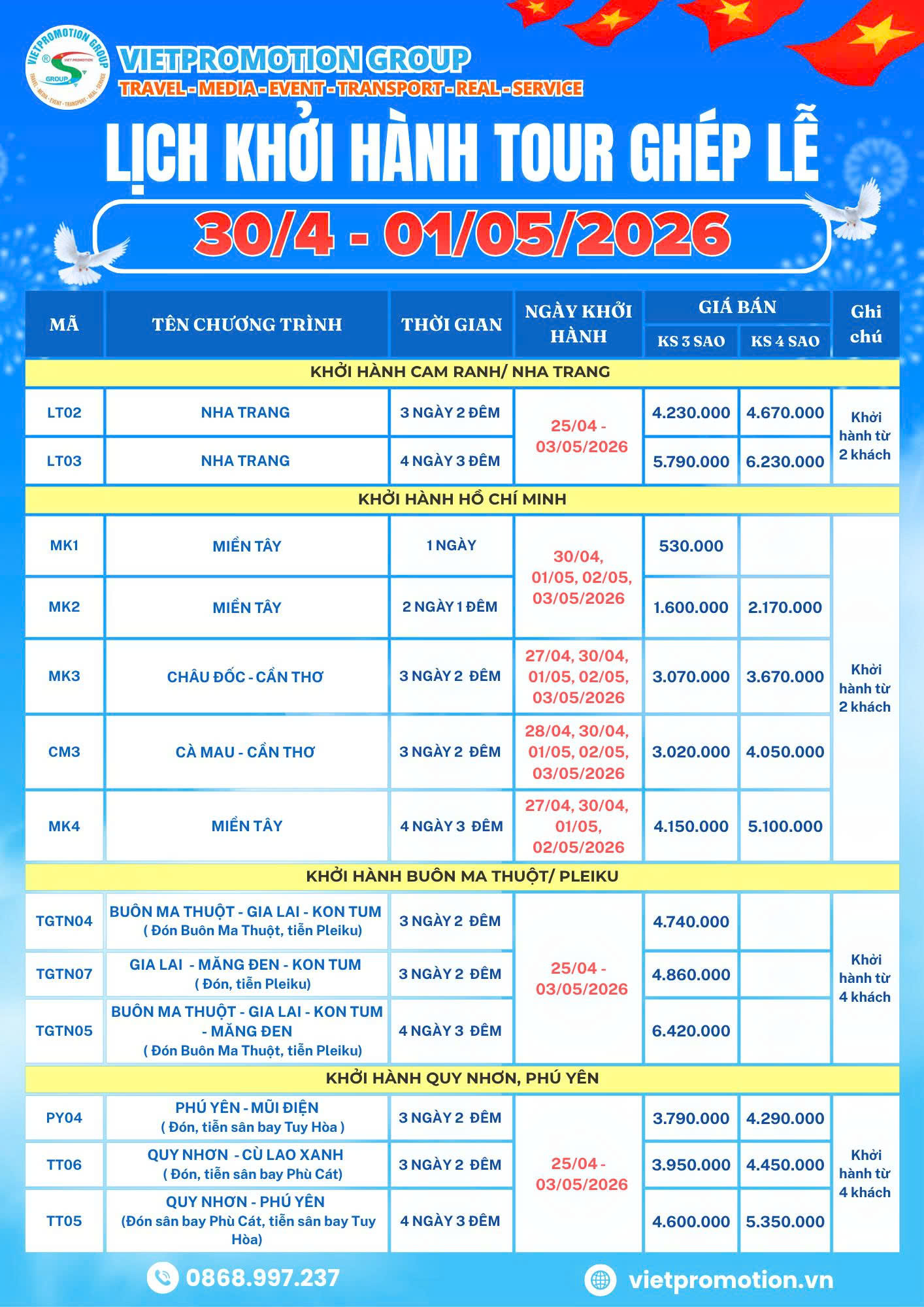 Nhằm phục vụ nhu cầu nghỉ dưỡng tăng cao trong dịp Lễ Giỗ Tổ Hùng Vương và kỳ nghỉ 30/4 – 1/5/2026, Vietpromotion triển khai chuỗi tour ghép và tour linh hoạt khởi hành liên tục đến nhiều điểm đến hấp dẫn trên cả nước, đáp ứng đa dạng nhu cầu từ khách lẻ, gia đình đến nhóm bạn và doanh nghiệp nhỏ.