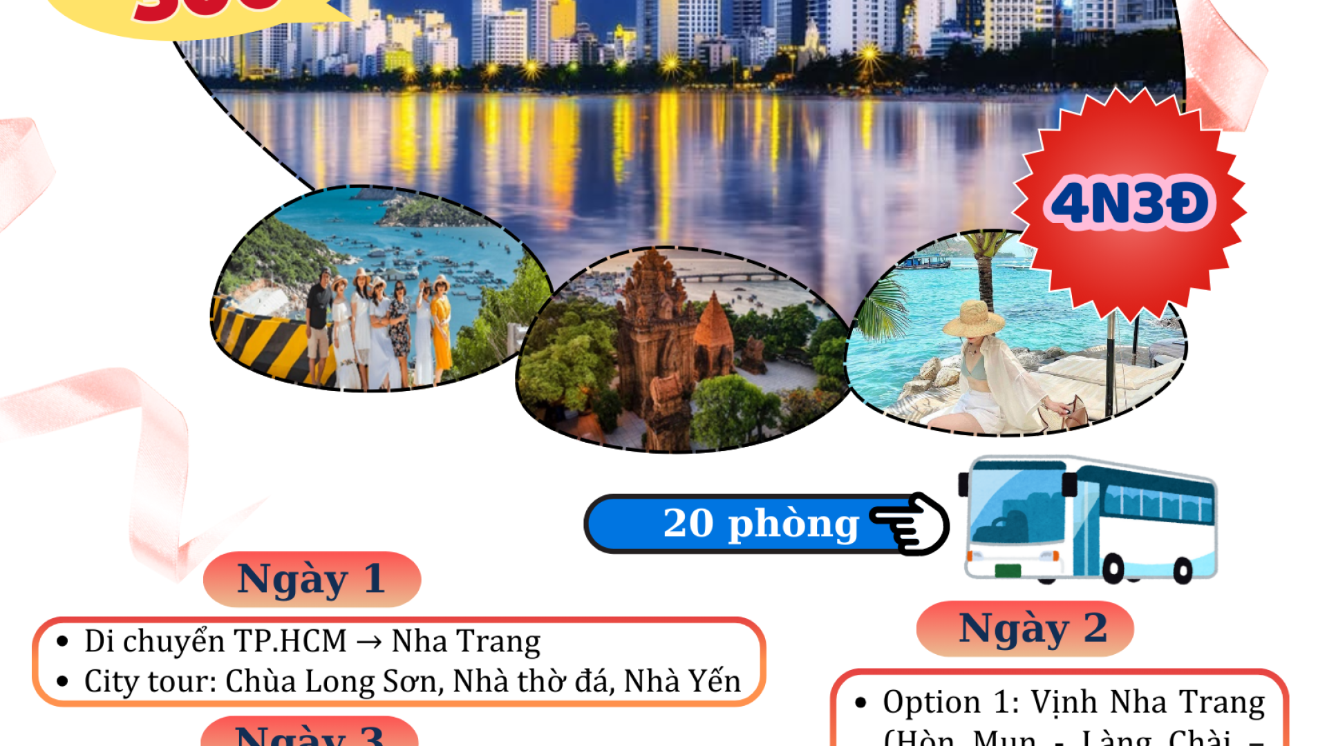 Nếu có nhiều thời gian ở Nha Trang tour 2 ngày trở lên du khách sẽ có thời gian đến trải nghiệm nhiều địa điểm nổi bật của Nha Trang. Từ trung tâm thành phố (Chùa Long Sơn, Nhà thờ Chánh Toà, Tháp Bà Ponagar,…) đến đảo ( Vinpearl Nha Trang, Đảo Hoa Lan, Đảo Khỉ, Hòn Tằm,…)