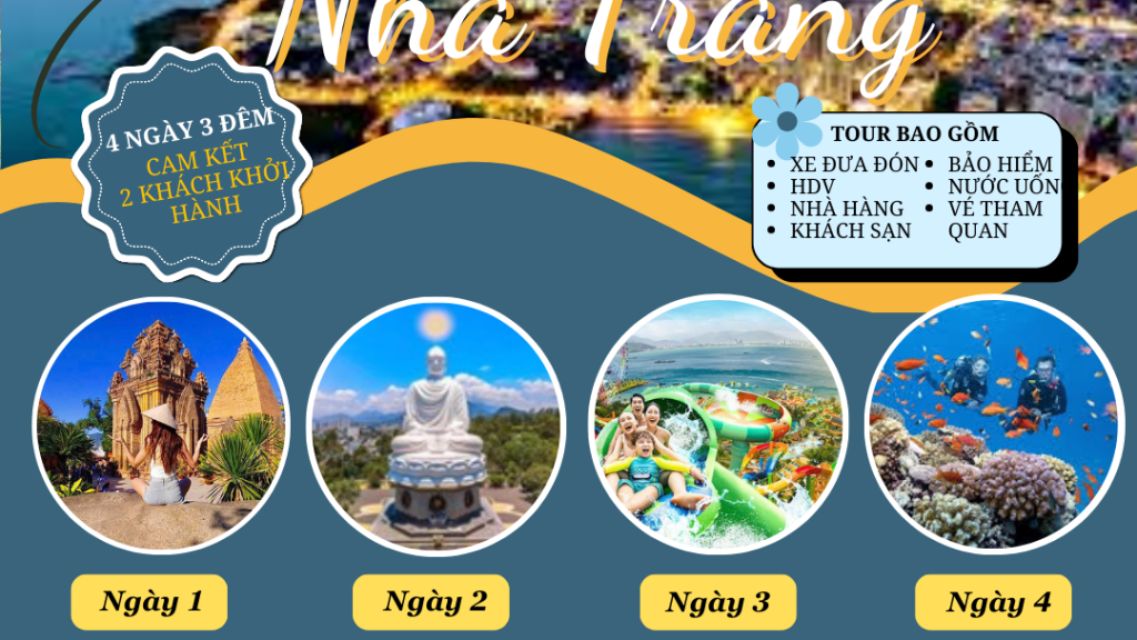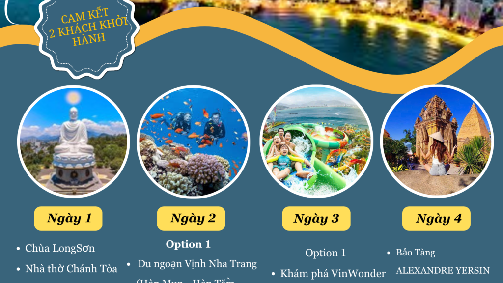 – Tối: Ăn tối tại nhà hàng. Sau đó, quý khách tự do khám phá Chợ đêm Nha Trang, Cà phê Bốn Mùa, Z-Beach, Happy Beach, Sailing Club, khu ẩm thực Tháp Bà.
